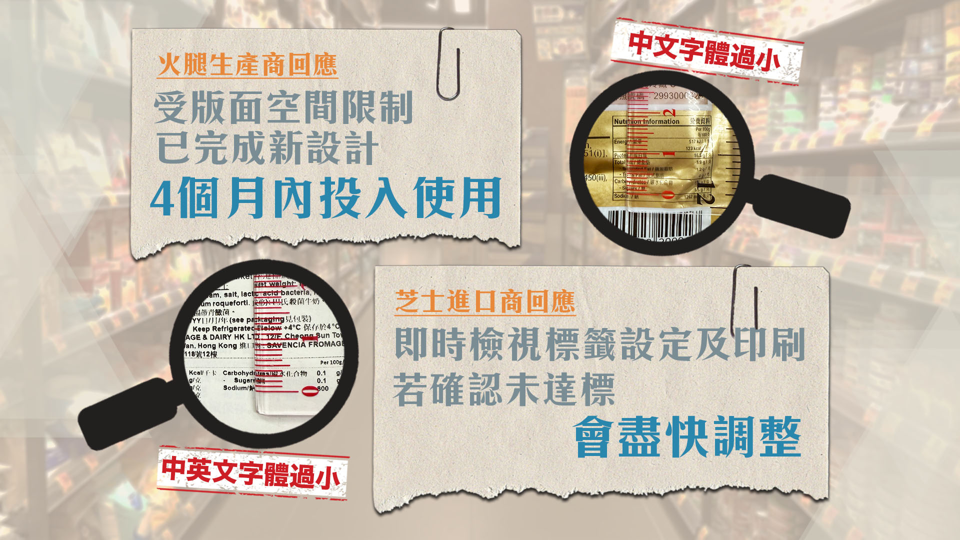 本台將懷疑營養標籤不符指引的14個食品資料,轉介食安中心。中心回覆查詢稱,確認當中8款產品的標籤字體未符合指引建議,如有足夠證據會檢控。一款火腿的生產商接獲本台查詢後表示,已完成新設計。