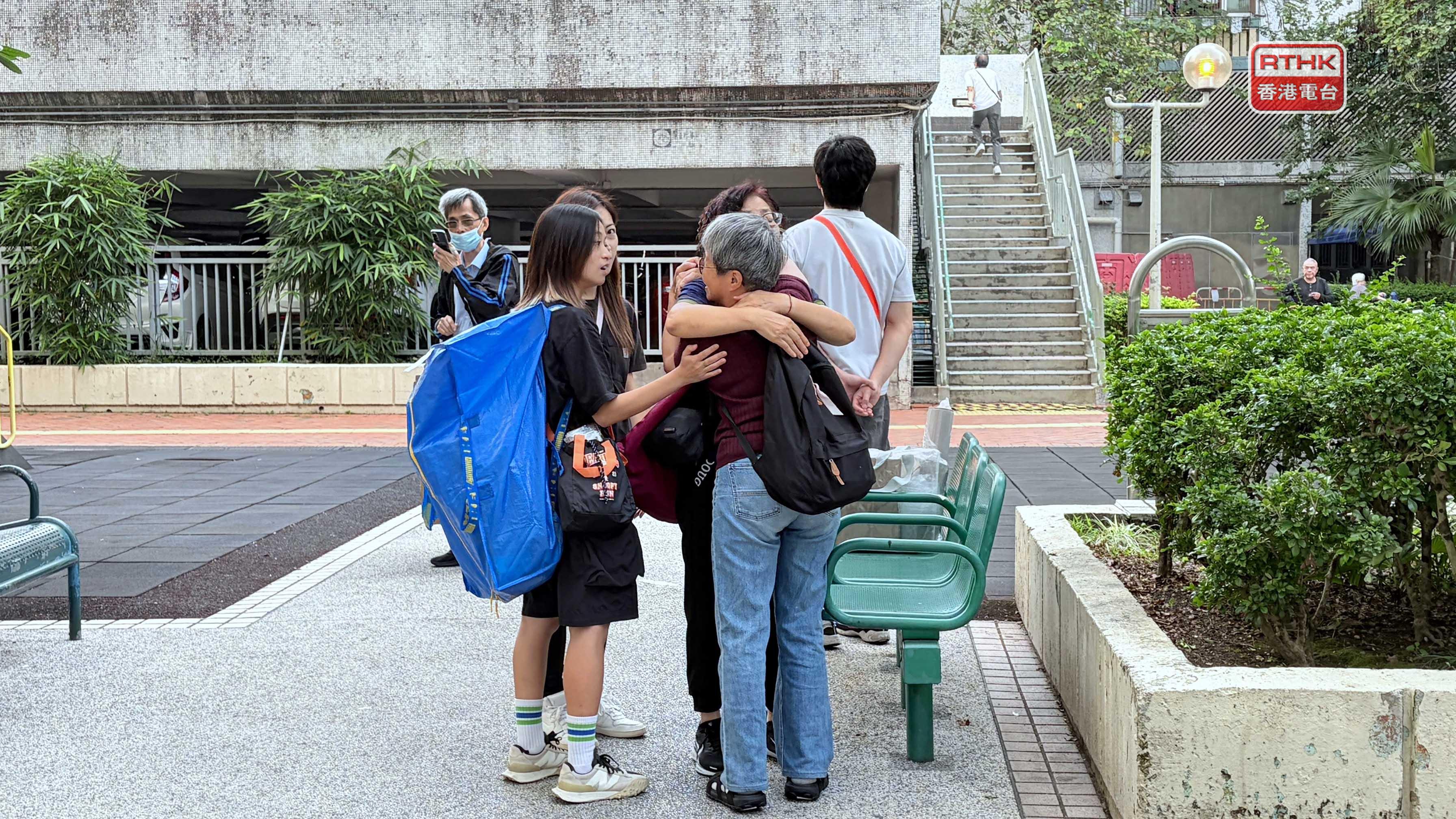 潘小姐與家人在等候登記上樓期間與鄰居相認,一度相擁和互相慰問。