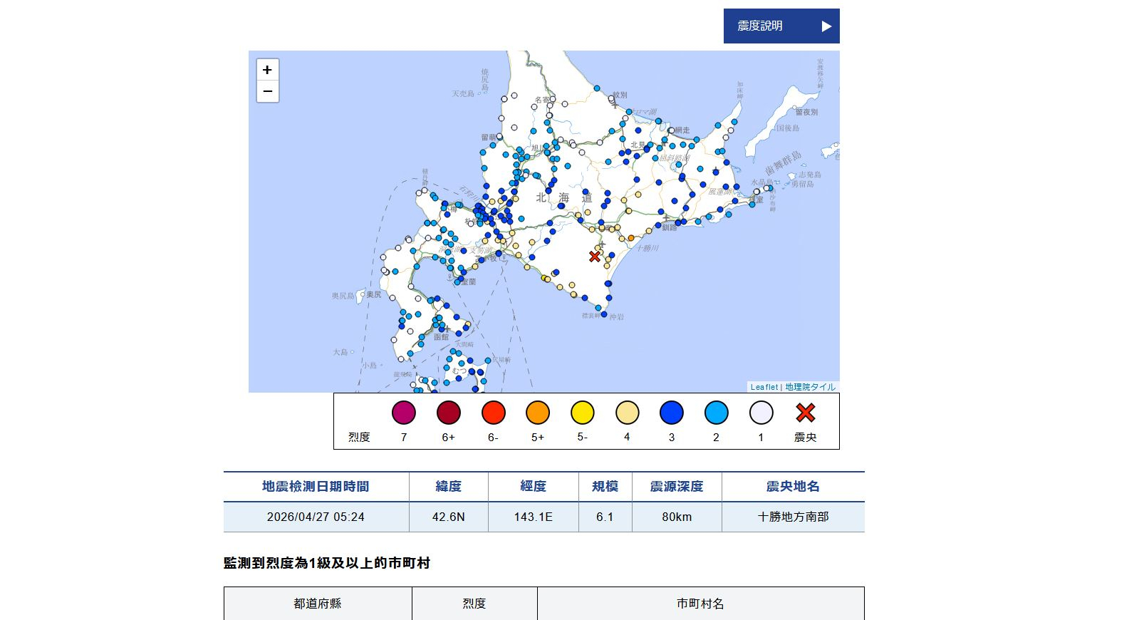 日本氣象廳表示,地震發生在當地時間清晨5時24分,震央位於十勝地區南部,震源深度80公里。