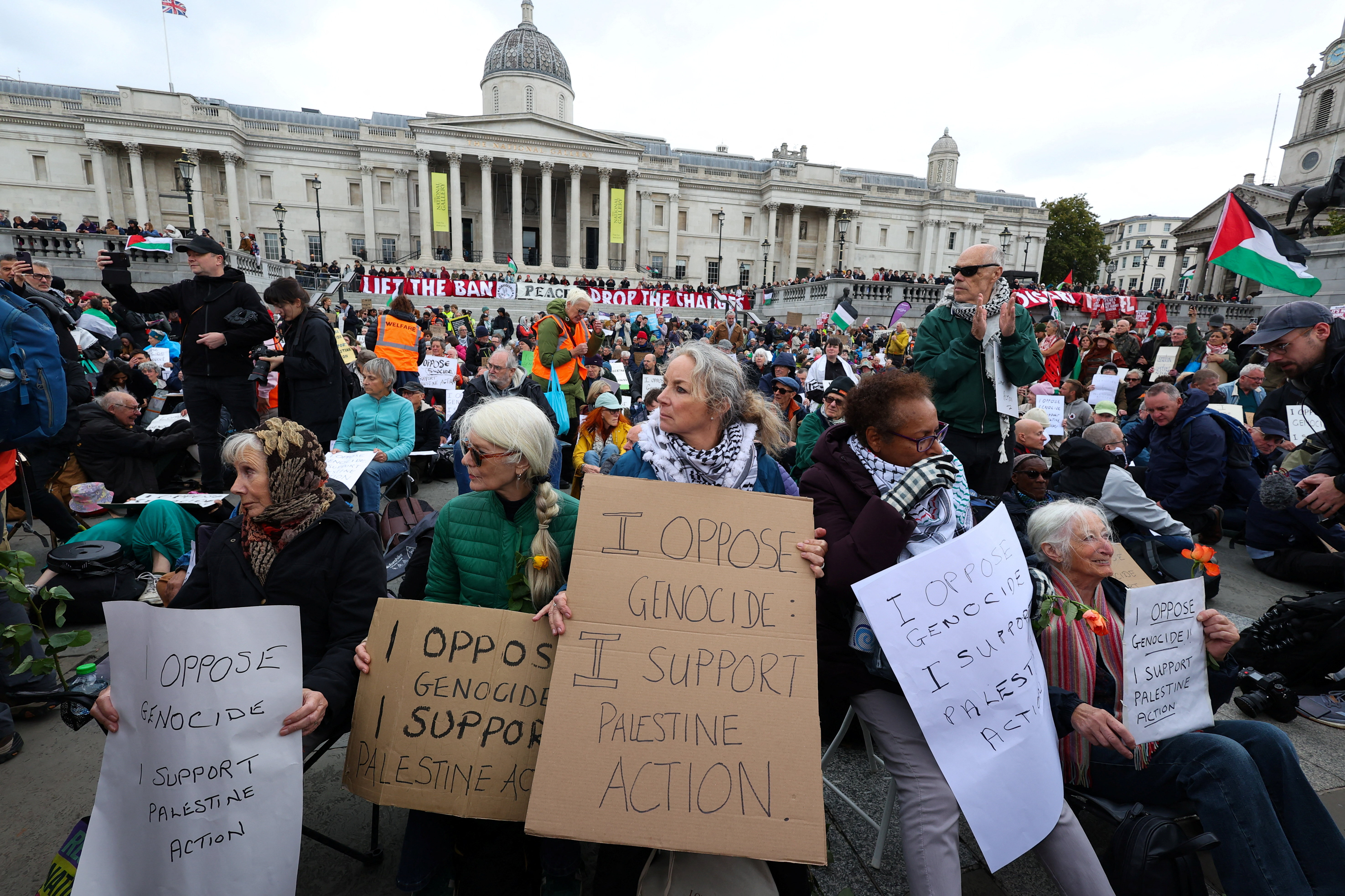 The demonstration is the latest in a series of protests, during which hundreds have been arrested for defying the ban which makes it an offence to show support for Palestine Action. (Reuters)