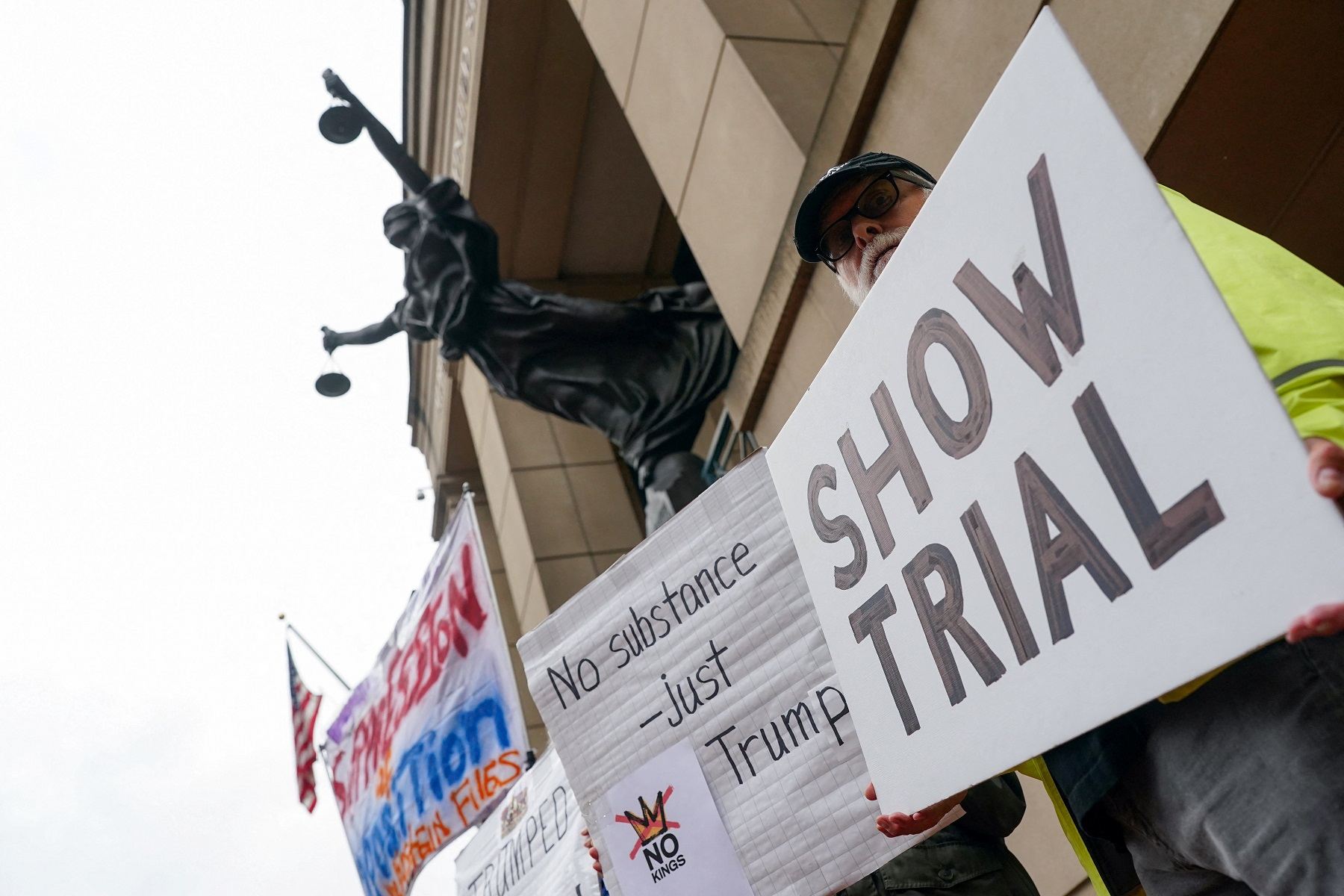 A few protestors had gathered outside the court ahead of Comey's arrival, including a man holding up a sign reading "Show Trial."