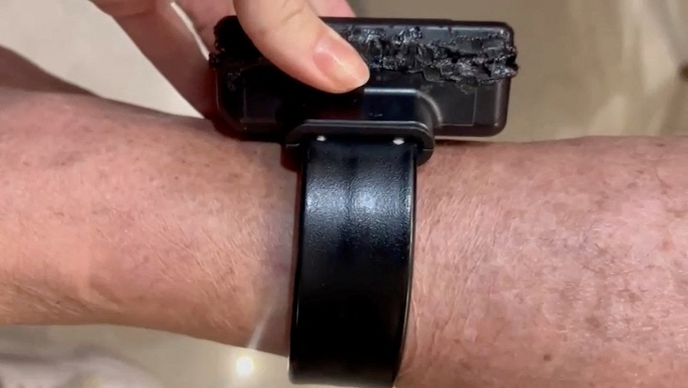 The video showed the device badly damaged and burned, but still on his ankle.