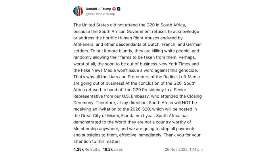 US President Donald Trump announced on Wednesday that South Africa would not be invited to next year's G20 summit in Miami, taking his diplomatic offensive against the country to a new level.
