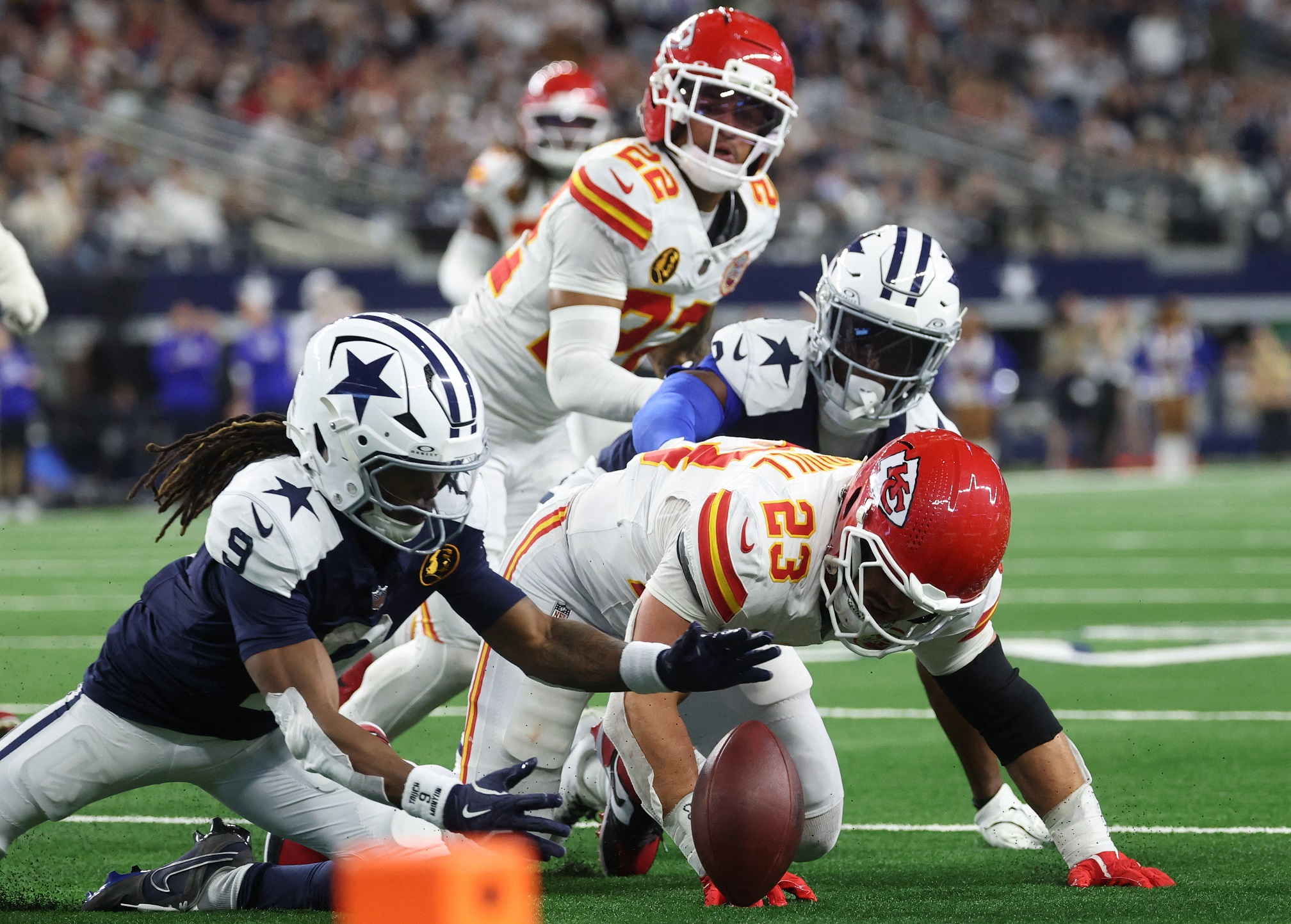 Cowboys wide receiver KaVontae Turpin, left, and Chiefs linebacker Drue Tranquill look to recover a fumble during the fourth quarter in the game won by Dallas. Photo: Kevin Jairaj-Imagn Images via Reuters