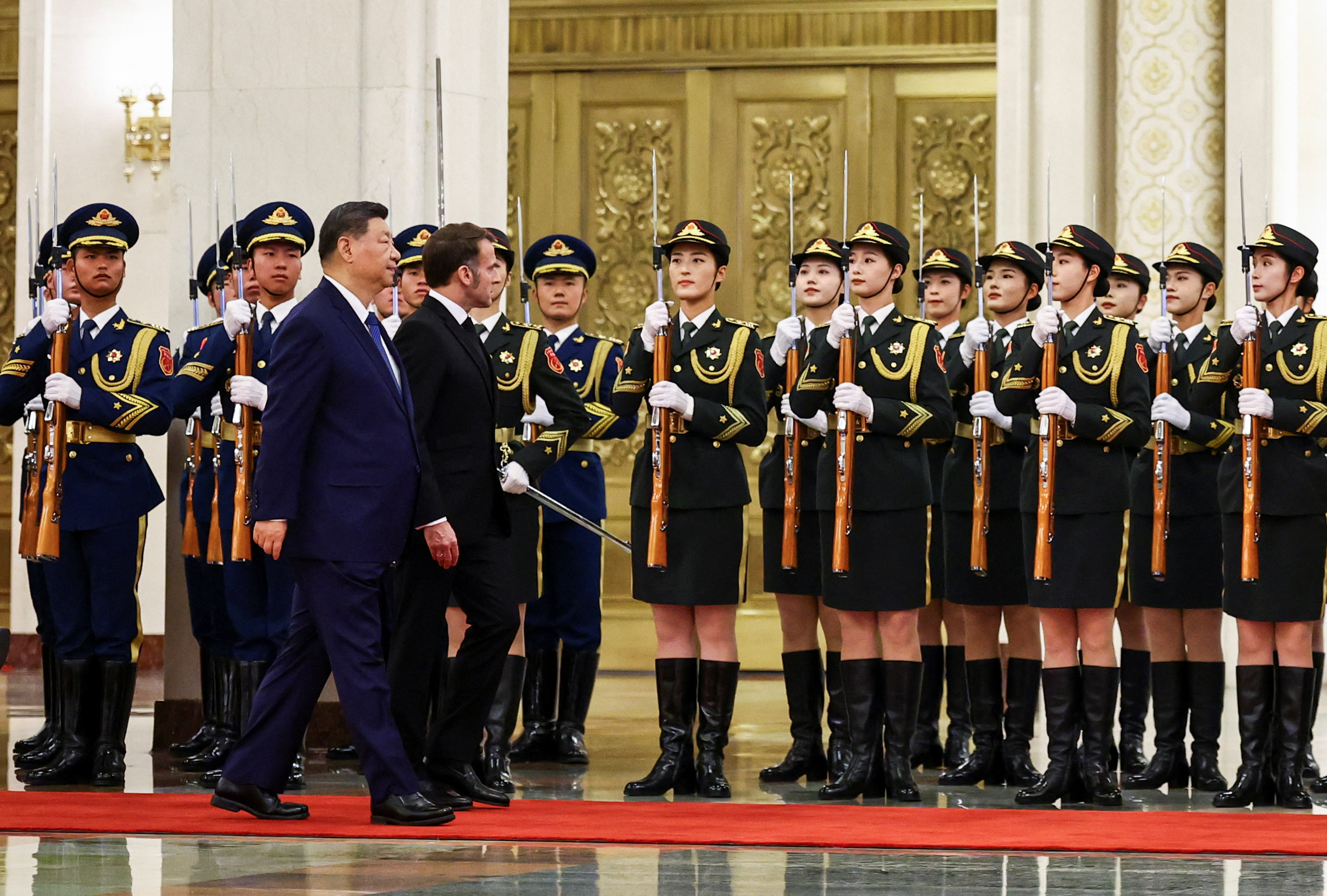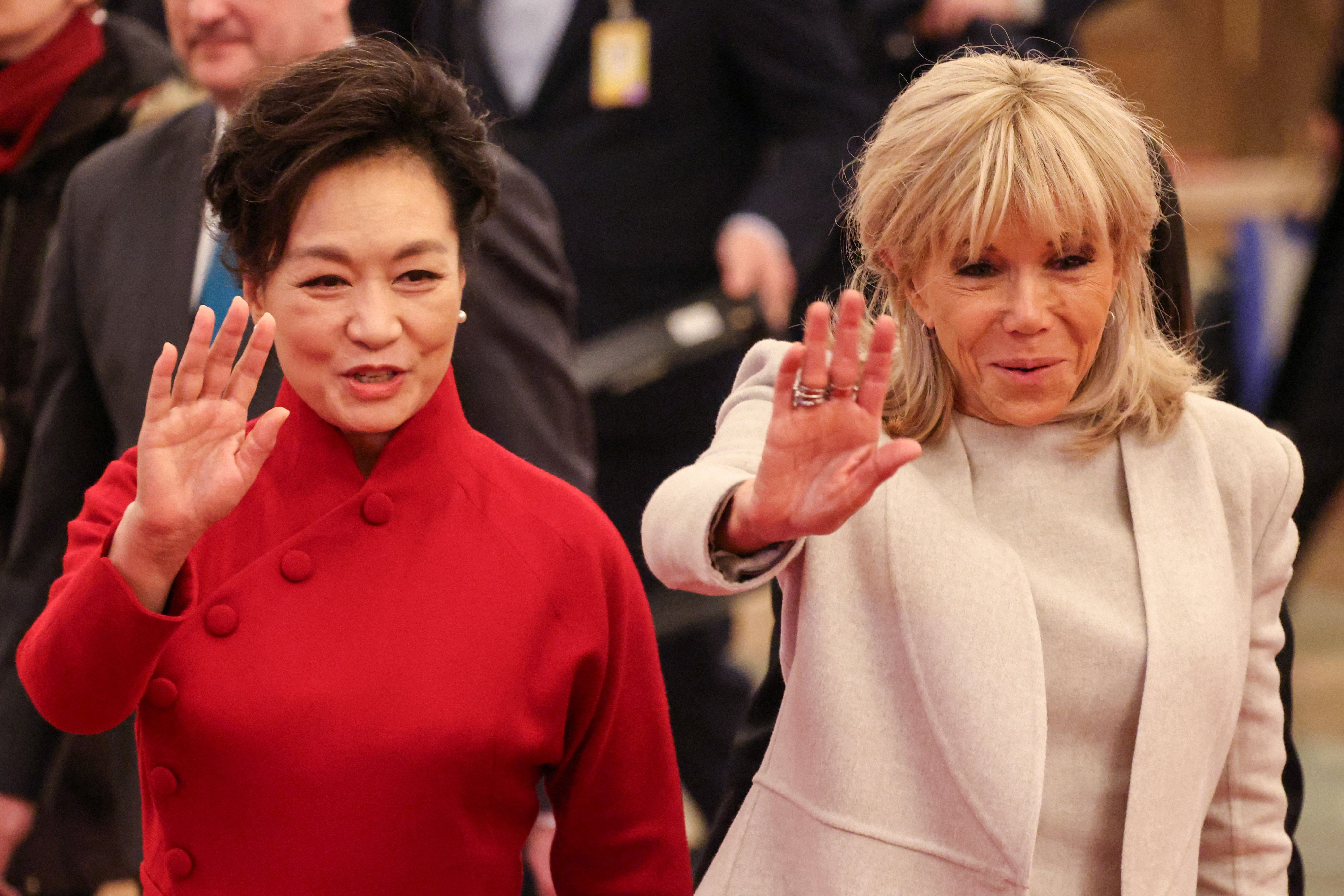 Macron and his wife Brigitte were given a grand welcome by Xi and his partner Peng Liyuan to the Great Hall of the People, where the ceremony was moved indoors due to the cold.