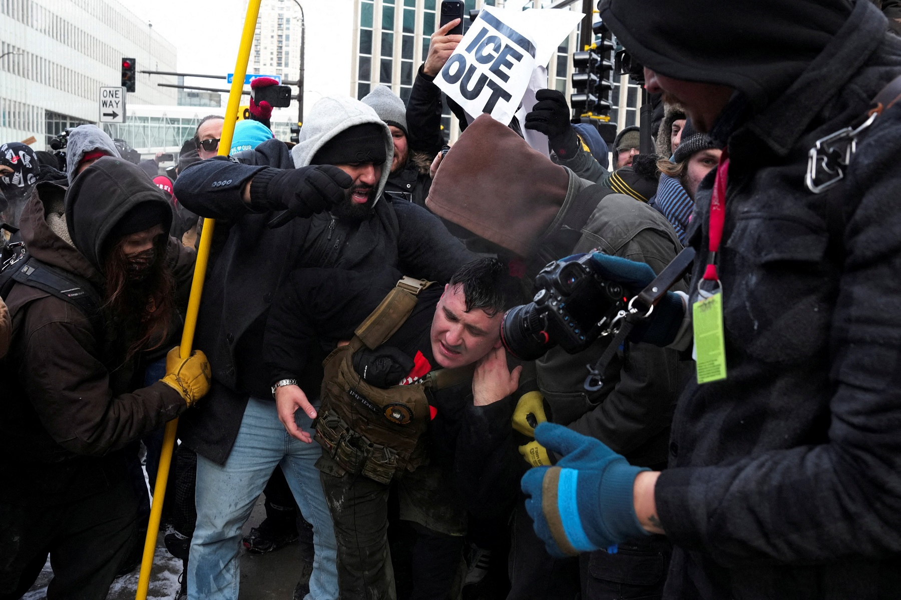 • Right-wing influencer Jake Lang appeared to be injured following clashes between pro- and anti-ICE protesters in Minneapolis. Photo: Reuters
