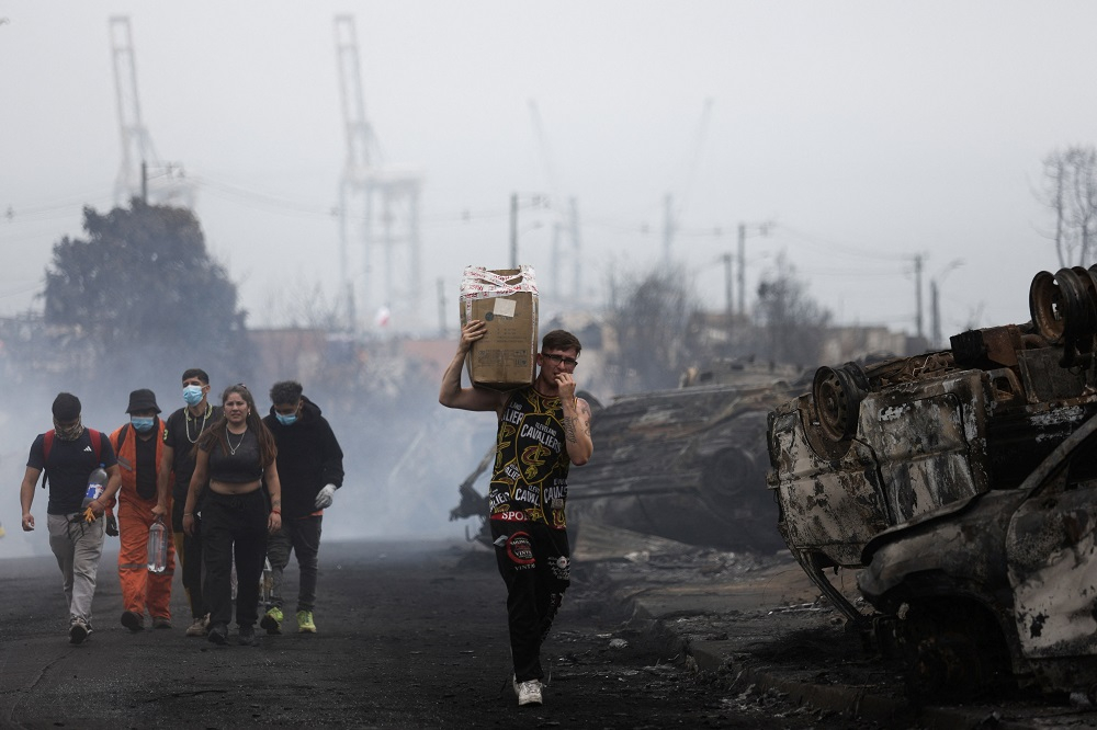 Around 1,000 homes were destroyed or damaged as the fires ripped through hilltop districts in the coastal town of Penco and adjacent port of Lirquen, leaving a blackened landscape of smouldering ruins.