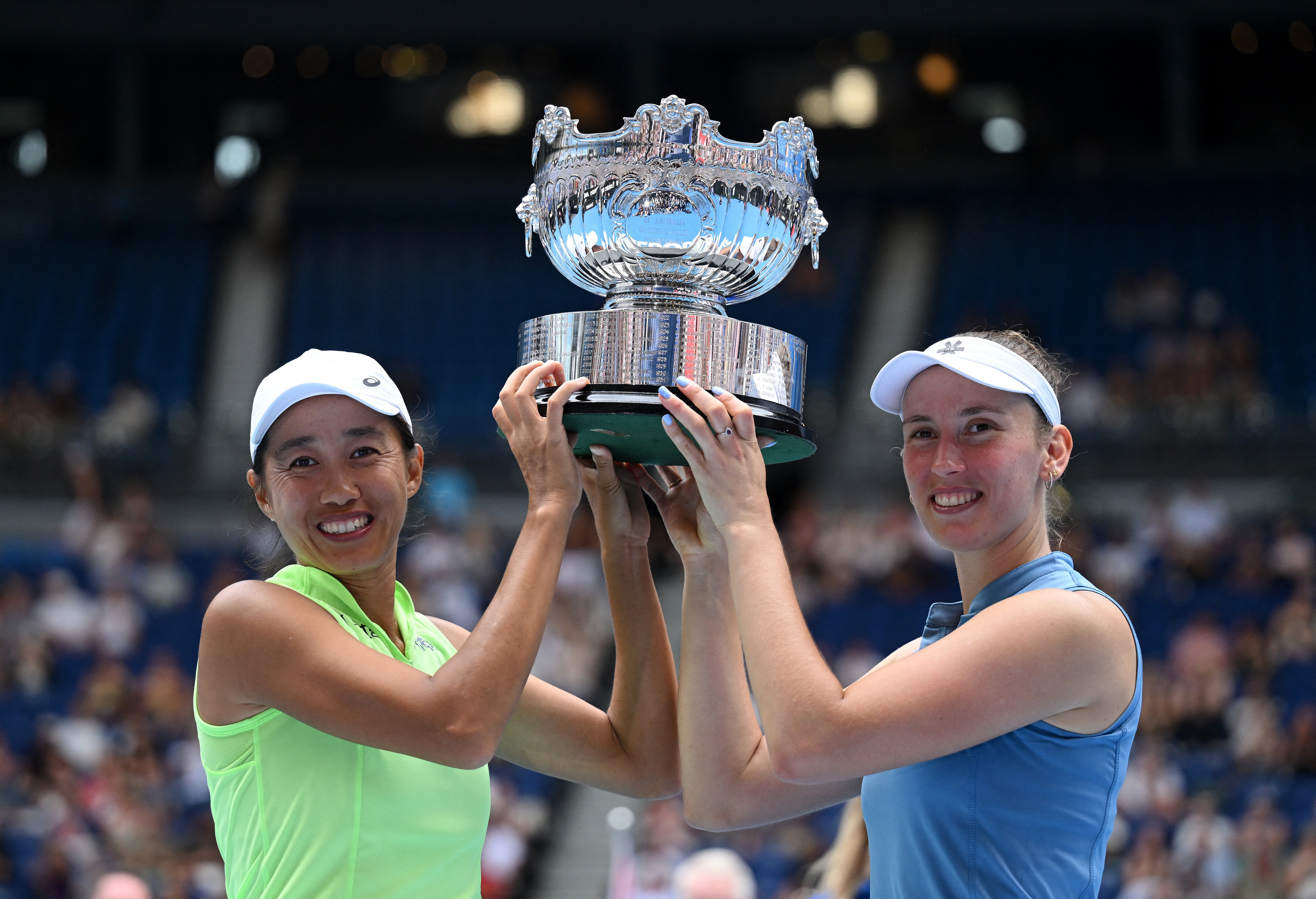 Fourth seeds Elise Mertens and ‍Zhang Shuai won the Australian Open women's doubles title on Saturday with a 7-6(4) 6-4 victory over Anna Danilina and Aleksandra Krunic, claiming their first Grand Slam trophy as a duo.