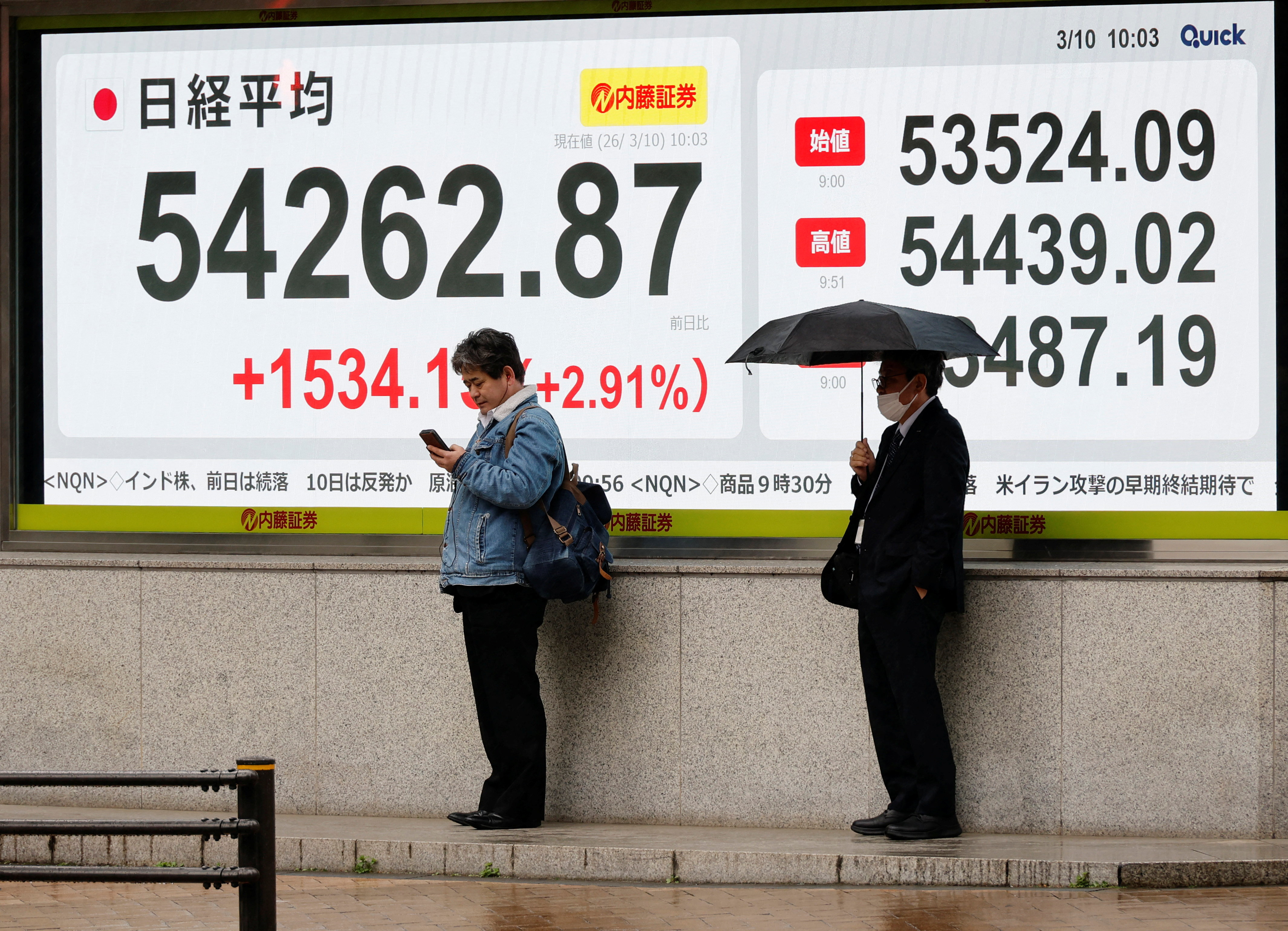 In Tokyo, the benchmark Nikkei 225 Index opened up 795 points, or 1.51 percent, at 53,524, recouping some losses after a 5.2 percent plunge on Monday. Its gains accelerated to 1,720 points, or 3.26 percent, at 54,449 just before noon local time. The broader Topix was 96 points, or 2.69 percent, up at 3,672.
