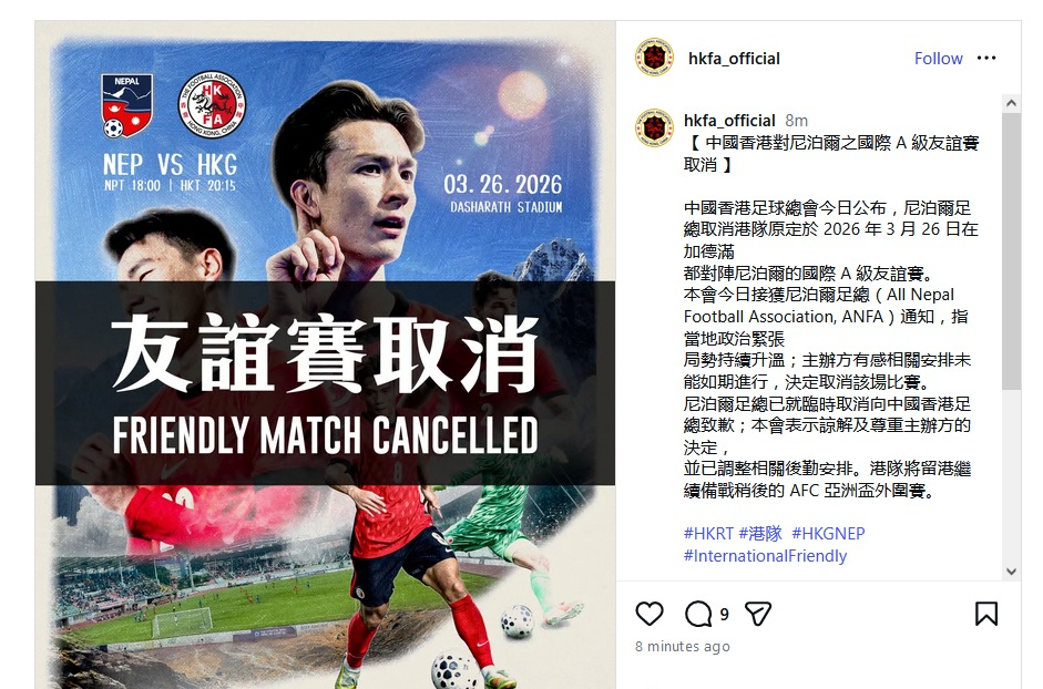 The Football Association of Hong Kong, China (HKFA) announced on Sunday that an international friendly match between the SAR and Nepal has been cancelled.